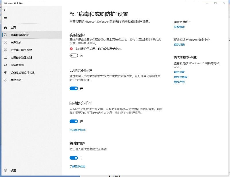 1.点击开始 > 设置 > 更新和安全 > Windows 安全中心 > 病毒和威胁防护 > “病毒和威胁防护设置” > 关闭实时防护。