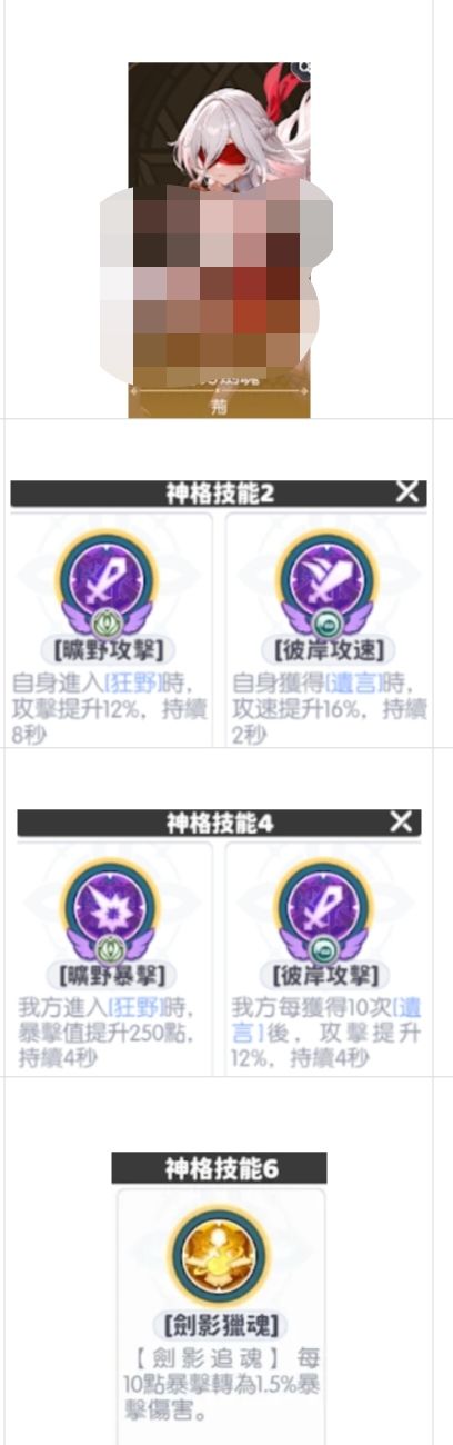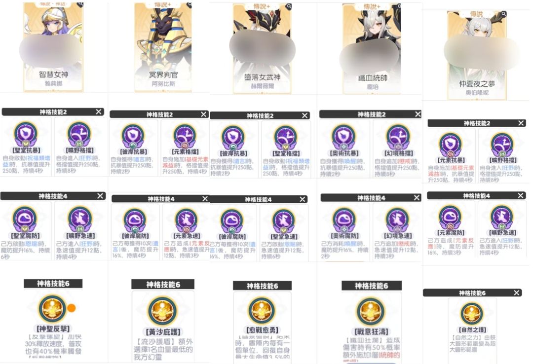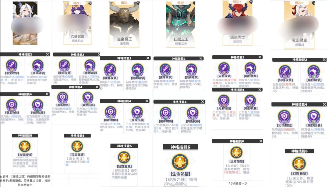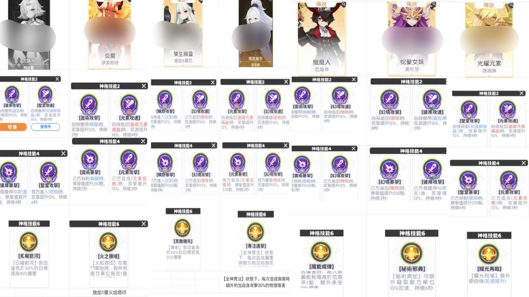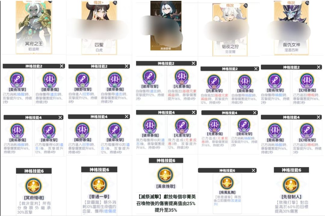 有兄弟想看看神格技能,画质一般大家凑合着看吧,神格很多角色的都一般,优先搞队伍的主C,例如炎魔加百列乌鸦等。部分冷门角色就没放,画质有限,一切以国服上线为准。