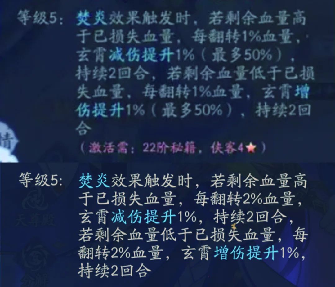 第二处:等级5,玄炎斩伤害的叠加值从累计反转血量从15%降低至10%,玄霄的输出降温。