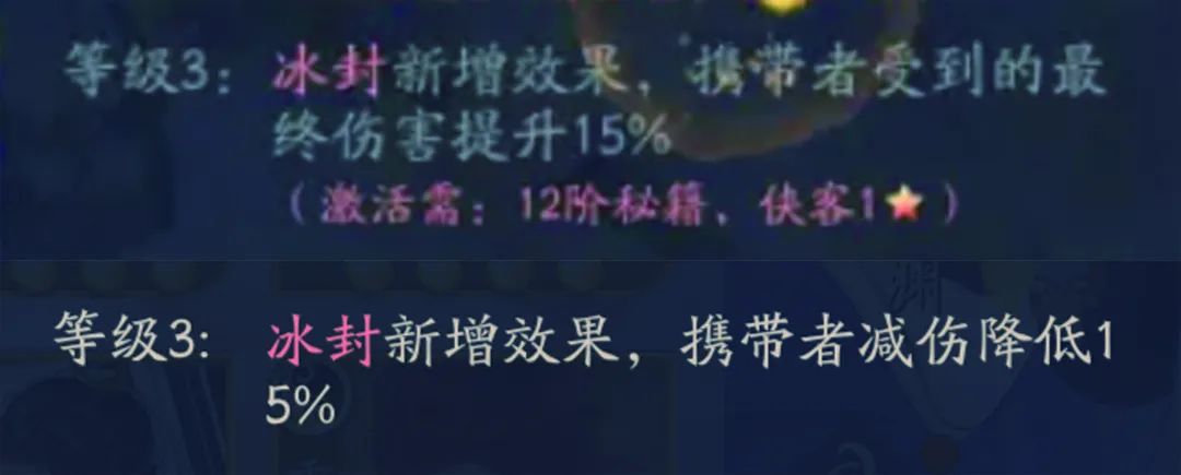 第一处:等级3,冰封BUFF受到的最终伤害提升变更为减伤,这个改动依尘感觉其实是针对神魔,很多时候神魔都有最终承伤降低100%,会被这个技能平账,导致打出伤害,当然这个改动也降低了玄霄的辅助输出能力。