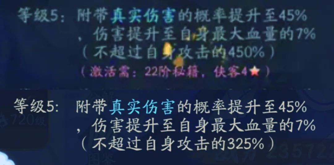 第二处:等级5,附带真实伤害上限从450%降低至325%,两条是一个成长联动,就看等级5就好。