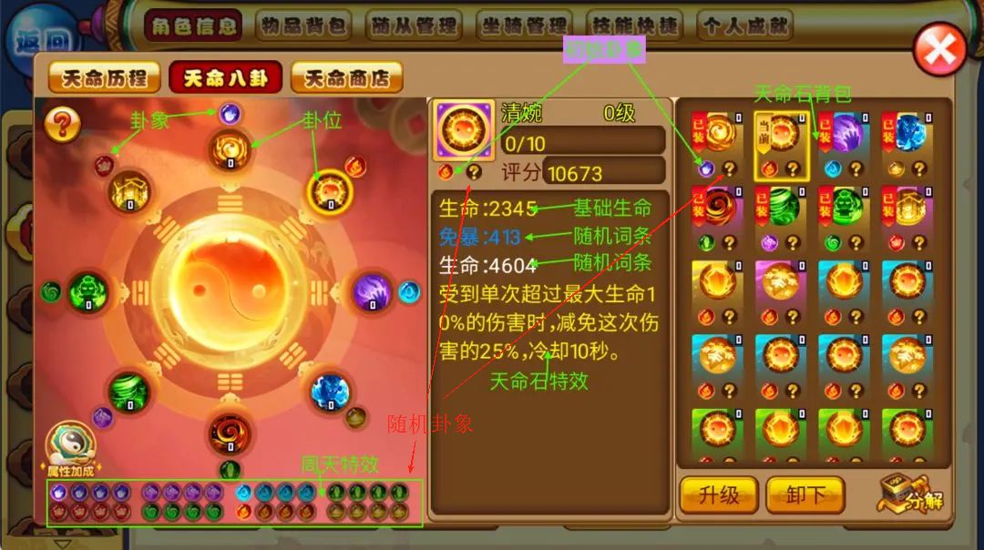 ⑤关于随机卦象和周天特效,现阶段暂时不需要考虑,注重天命石的特效和属性就好,随机卦象和周天,要很长一段时间后才会涉及到