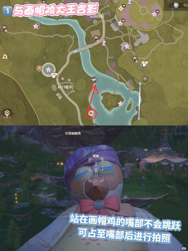 注:站在画帽鸡身体部位会触发跳跃,可跳起后站在画帽鸡嘴部进行拍照