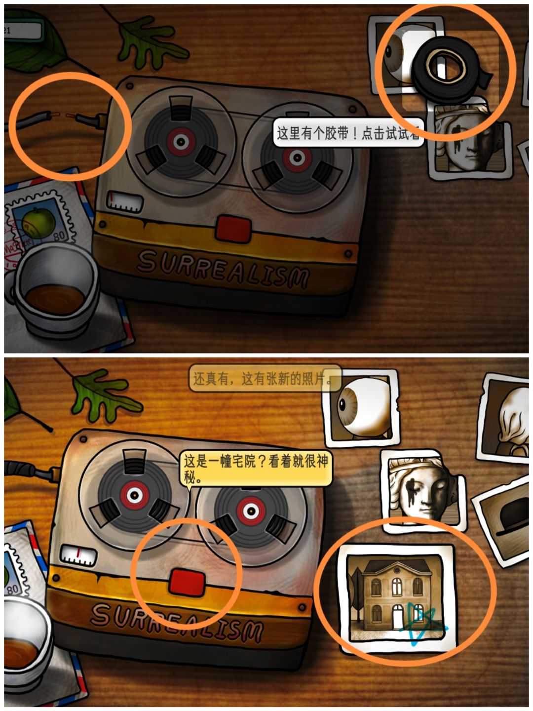 新手开局:根据提示发现录音带的开机线断掉了,拿取桌子上的胶带将断掉的电线粘好,点击录音带的红色开关按钮,等待对话结束点击桌子上出现的别墅照片。