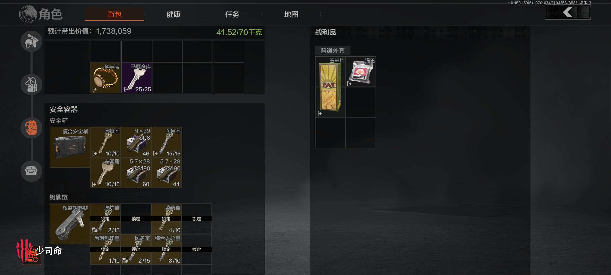 还有你连续多局没出货还没撤离就有补偿局,图里出了主客房的那局我连续15局没出货也没撤离,我是单排电视台直奔保险的,15局亏了两百多万,然后补偿局就来了,补偿局匹配会特别慢我主客房那把匹配了三个两百秒,开局三分钟打死两个人然后就没见到其他人了,钥匙还都是我开的,就服装室和黄卡的免保没摸到,保险摸挺多大金让别人摸走了,这局带出260万直接把前面15局亏的给赚回来了。