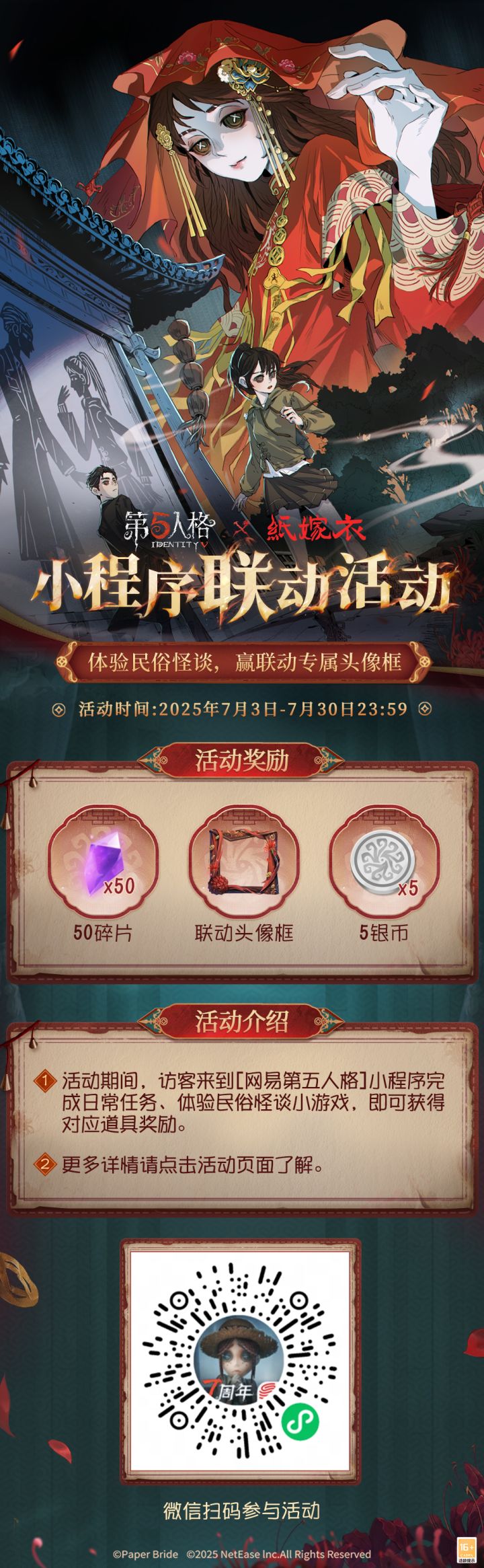 第五人格×纸嫁衣联动小程序活动现已开启! 7月3日-7月30日23:59活动期间,前往【网易第五人格】官方小程序活动专属页面,绑定游戏账号,完成联动任务,可获得【头像框-纸嫁衣】等活动奖励!
