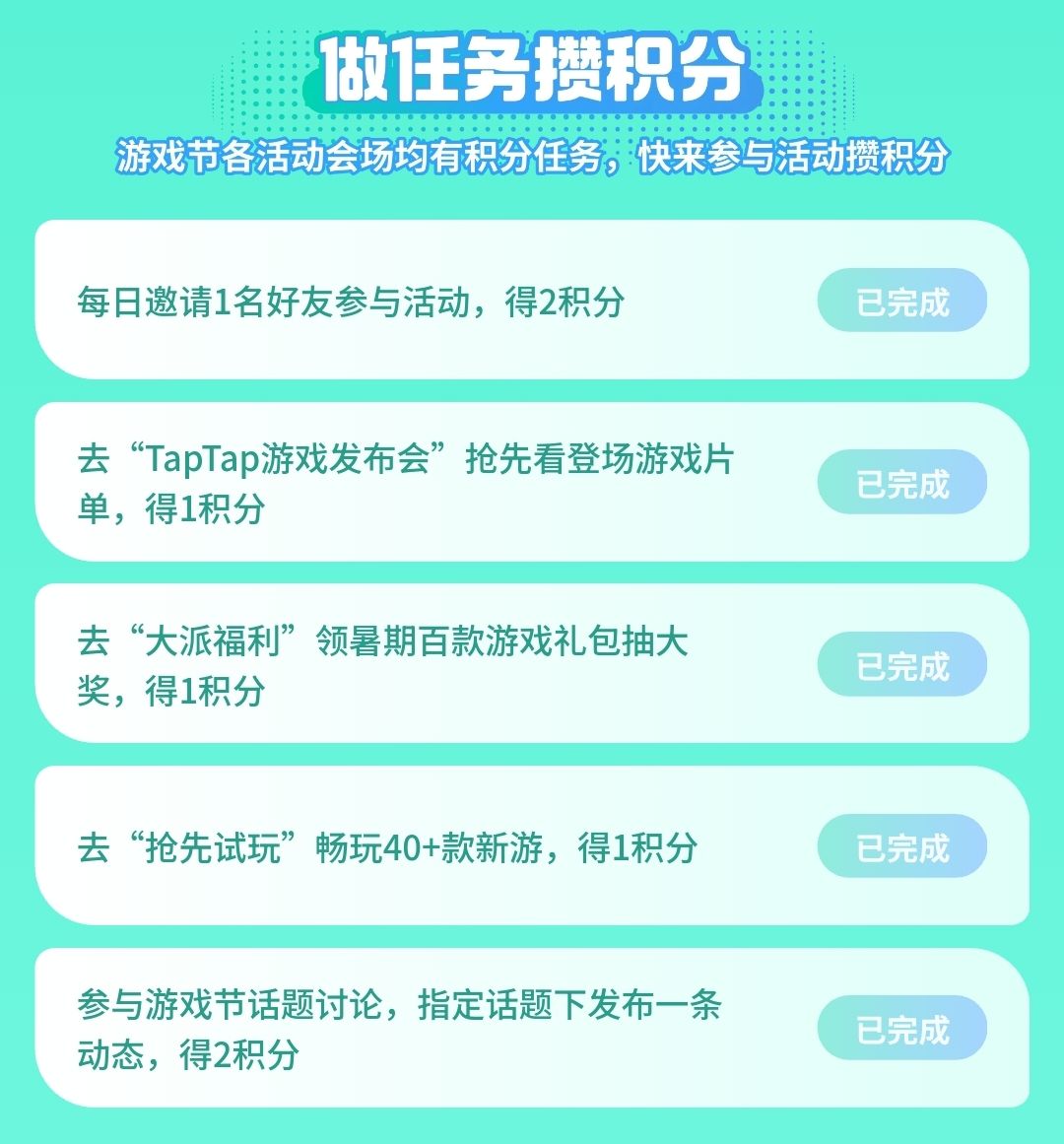 1️⃣“游戏节”任务可获得7积分【绿色背景】