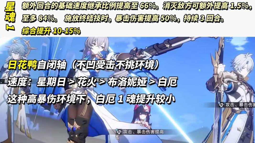 「星魂1」50%暴击伤害、额外回合的基础速度继承比例由60%提高至66%,且每消灭1个敌方提高1.5%至多84%。需要消灭12个敌人才能叠满,显然是偏向于虚构叙事对群环境。综合提升在10-15%,取决于你暴伤拐到底带了多少,如花日鸭劲爆三拉轴,都是暴伤拐,这稀释就非常夸张咯~