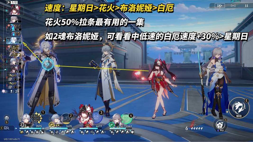 ※速度方面,星期日/停云>花火/记忆主>布洛妮娅>白厄,如果你有2魂布洛妮娅,到是可以进一步考虑白厄在吃到30%速度加成的情况下能够超过其他队友速度。如此一来在终结技结束时可以第一个行动,多叠战技2层火种,下次启动更快~