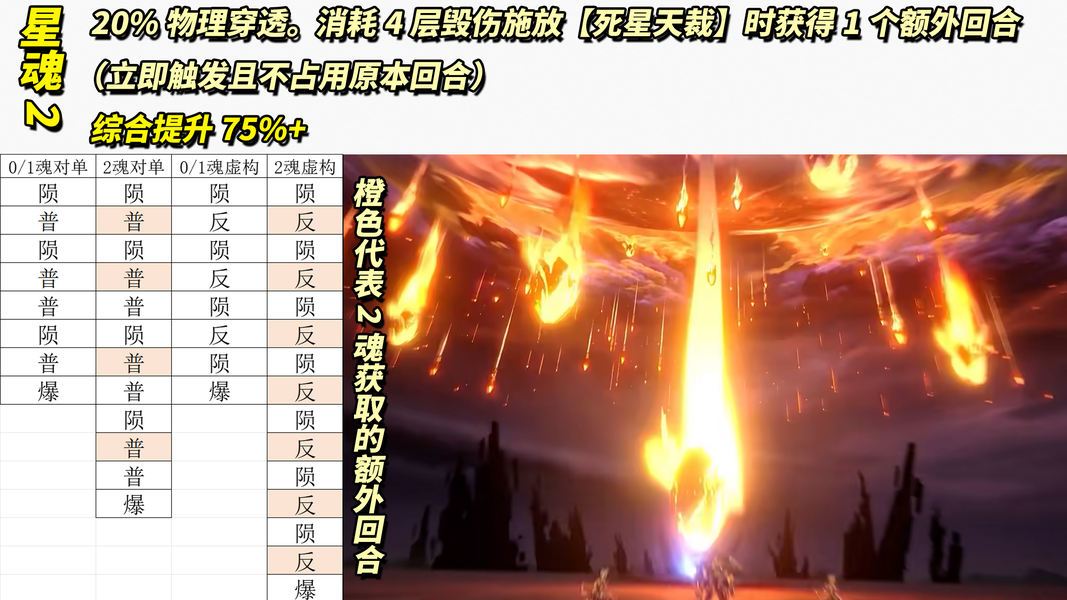 「星魂2」20%物理抗性穿透,施放消耗4毁伤的【死星天裁】技能(那个陨石雨)时,获得1个额外回合(不消耗剩余次数)。0魂、1魂终结技期间就8次行动,2魂则是12/15次行动,这提升就非常夸张了喔!取决于是否逆属性、是否对群、队友穿透有多少,综合提升在75%+,夸张喔!