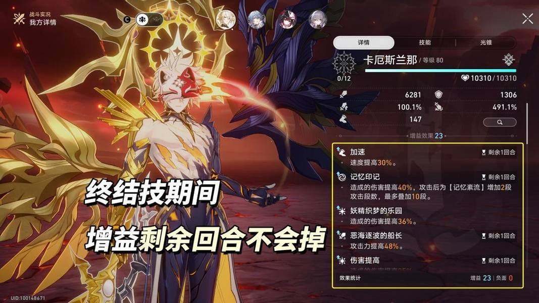 【终结技充能】需要12点火种激活终结技,入战1点、队友技能以你为目标1点、队友为你提供能量恢复的技能效果1点、敌方攻击你1点、白厄战技2点。我们需要尽可能快且满增益状态进入终结技变身,开启正式的输出。※期间全是额外回合,增益剩余回合不会消耗,包括布洛妮娅这种仅1回合增伤的效果,也能全覆盖白厄终结技创造的8个额外回合!