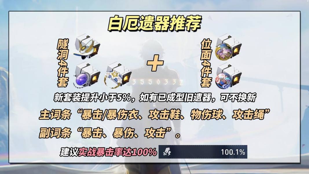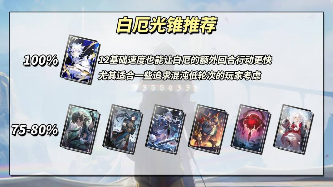 ※白厄不建议堆过多速度,因为终结技期间的8个额外回合,其行动值是基于“白厄60%基础速度/8”计算出来的,非基础速度只能在变身前协助排轴。※实战暴击率尽量确保达到100%,因为白厄战技的陨石和终结技结束的爆炸伤害都是单段,若未暴击损失严重!