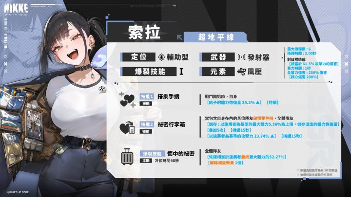 索拉是一个擅长治疗队友的辅助型妮姬。