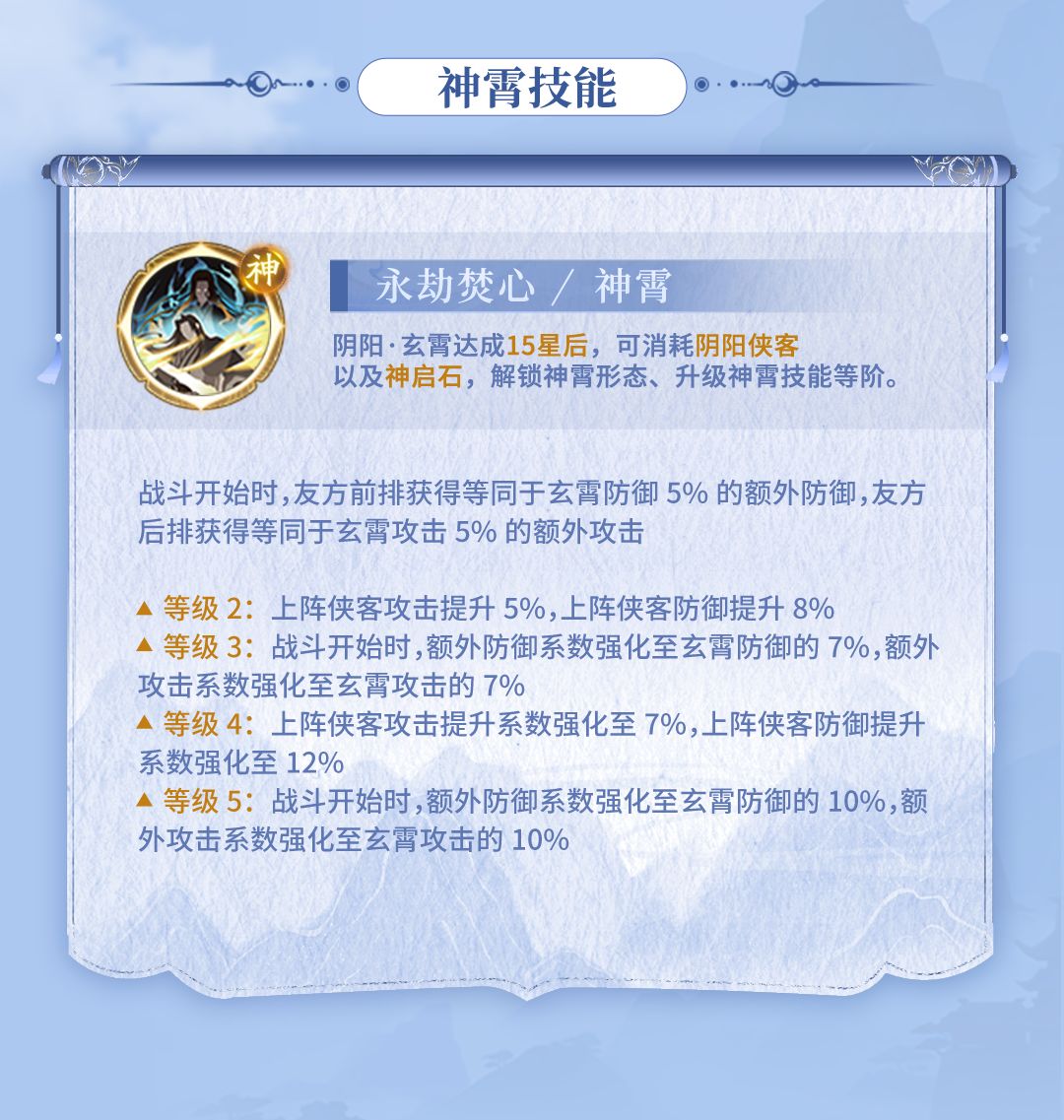 - 解锁神霄技能:6星神霄侠客本体*1、神启石*1