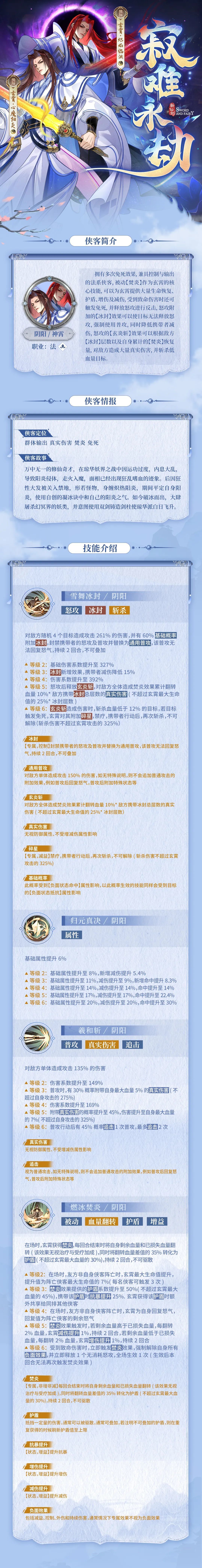 “神霄”是“仙灵”品阶之上的更高品阶,新阴阳侠客达成15星后,即可消耗神启石及侠客本体,进化为神霄侠客,解锁专属【神霄技能】和【神霄形态时装】!消耗侠客本体及阴阳侠客狗粮,即可升级神霄技能。