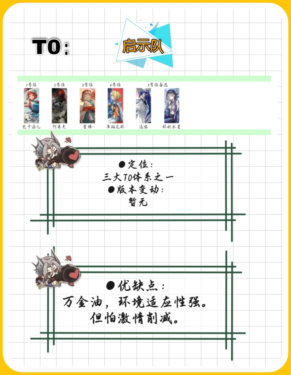(体系阵容的统计,截止于3.0版本。推荐根据敌方阵容以及环境buff灵活选择配队。备选非次选,有时会更优。 另外卡卡高压环境表现也不错,推荐用三塑卡卡。)