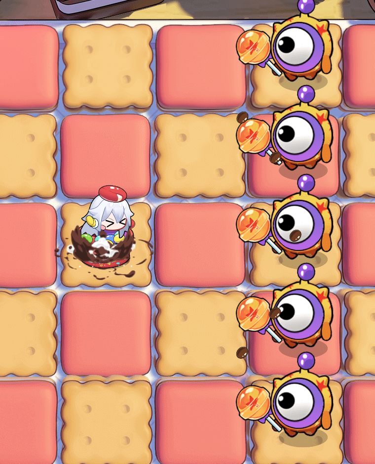 彩虹攻击:投掷两颗彩虹糖,攻击范围内最近的一个目标。彩虹糖会附带随机元素属性效果,投掷一定数量后会休息一段时间(20颗彩虹糖)