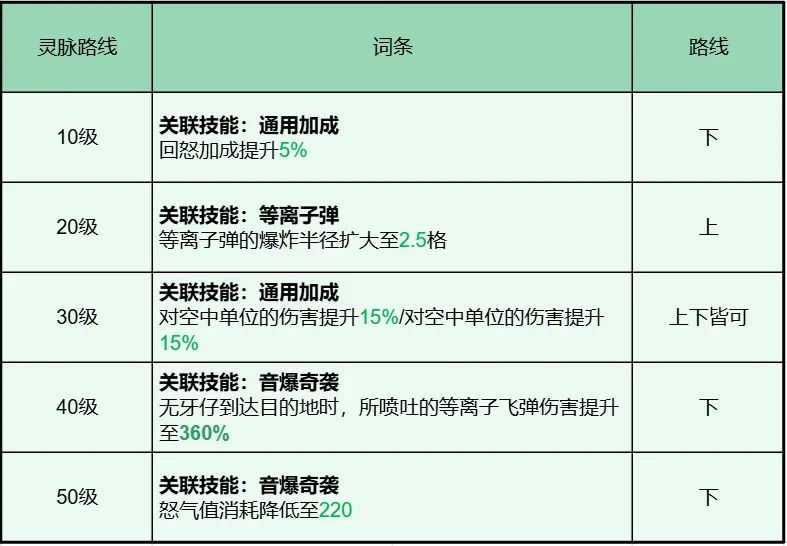 2. 20级选择提升等离子弹爆炸半径扩大。40级选择强化音爆后的等离子弹伤害,秒杀后排的关键。3. 50级和10级选择回怒和降低怒气消耗,更多次地释放范围伤害和等离子弹。