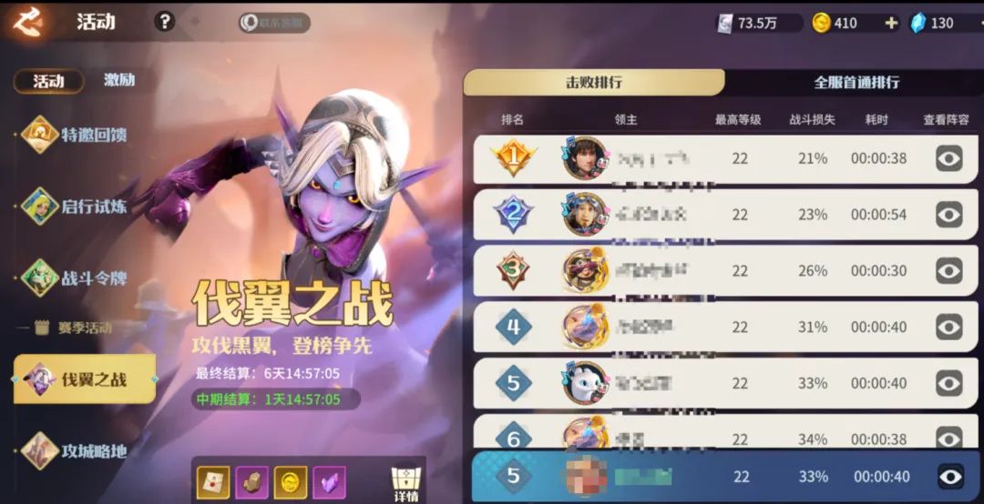 排名靠前全部为夜煞天骑队伍,排名第一的玩家甚至只用了史诗夜煞天骑就做到了低损高速消灭22级黑翼。