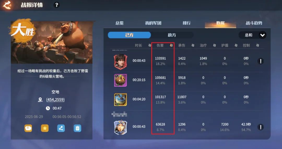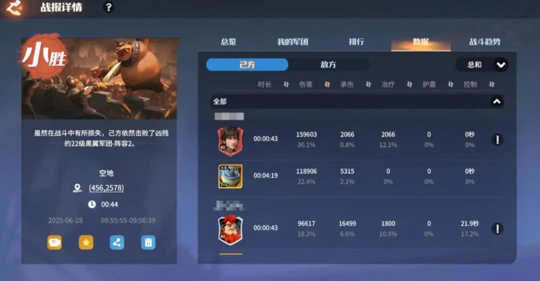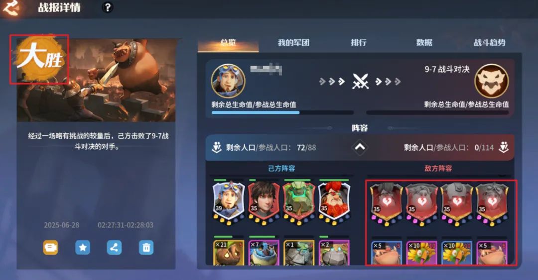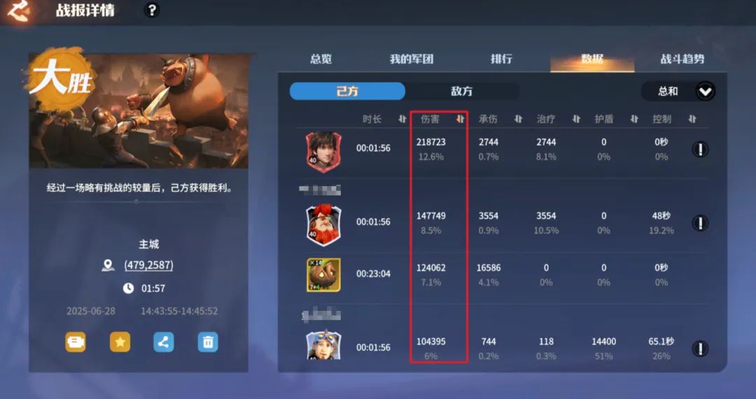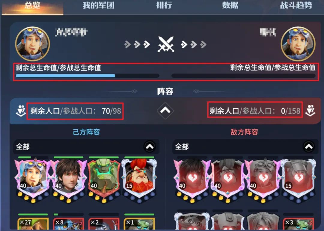 用一封荣耀角逐的战报简单描述下上述逻辑:虽然红度和人口数量左边领主不如右边领主,但左边罗宾+夜煞天骑队伍培养度高,高养成下这只队伍一旦取得优势,可以无限的进入回复怒气-控制-减防-易伤-无视距离秒杀的循环逻辑,对方无法还手只能坐以待毙。