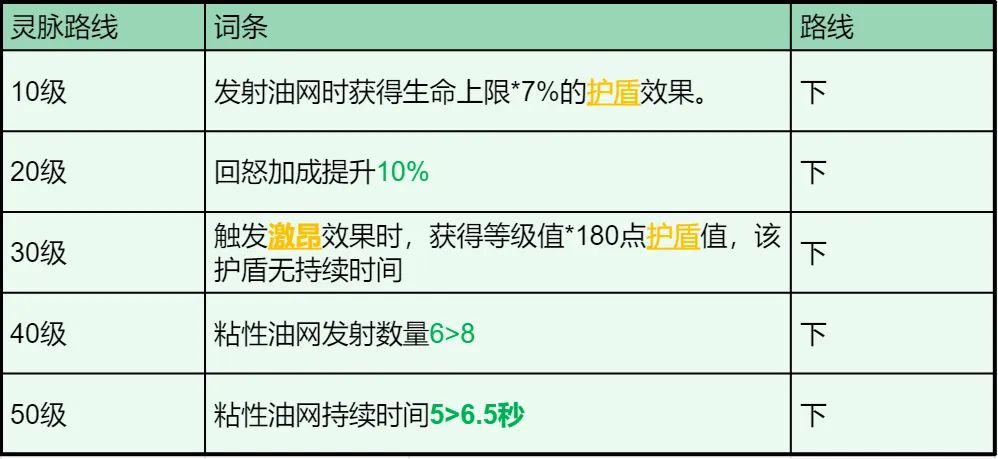 提升回怒,提高护盾触发效果,提高粘性油网数量和控制时间,辅助夜煞天骑输出。