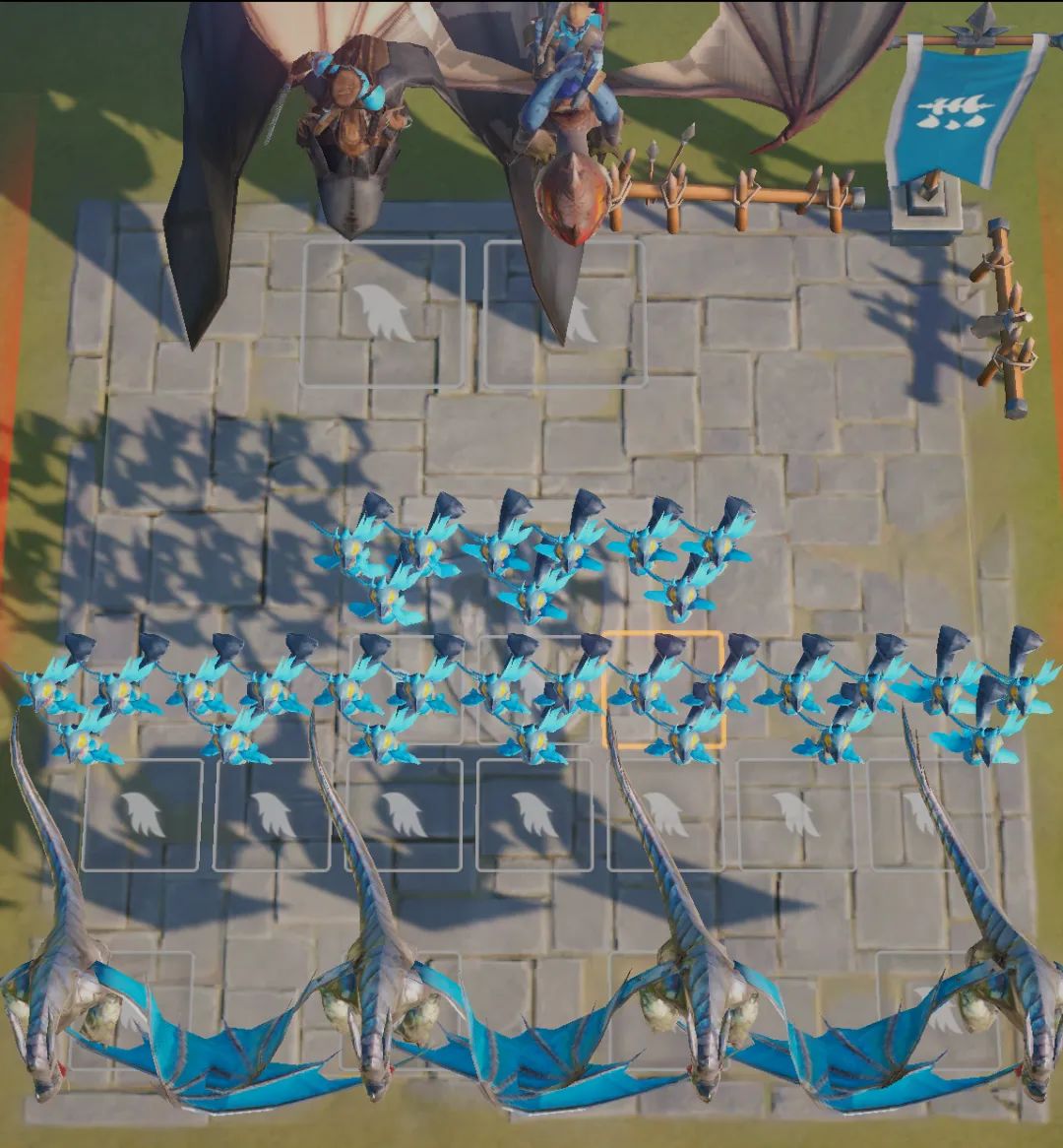 队伍站位:高防御高血量的利刃魔龙在前方承伤的同时,还能补充长时间大范围的控制,利刃魔龙前排交叉站位保证控制覆盖面积最大化,补充密林掠食者分摊伤害,给后排双英雄提供输出环境。