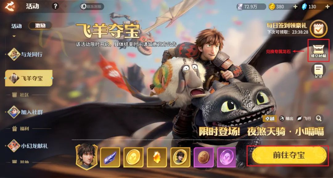 参与开服驯龙庆典中的飞羊夺宝活动获取,时间为开服第三天开启。参与活动可获得夜煞天骑本体的同时,还可凭借抽取的材料兑换夜煞天骑专属龙石。夜煞天骑自身强度非常高,参与活动还能获取他的专属龙石和超多卓越龙石碎片、原初星芒等珍稀道具,性价比很高。