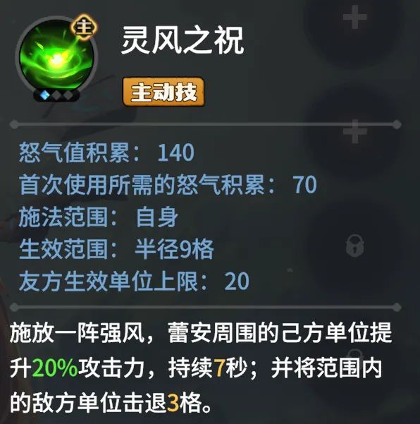技能特点:主动技能,释放后以自己为中心提升周围单位攻击20%,附带击退效果,对后排输出核心增伤明显。