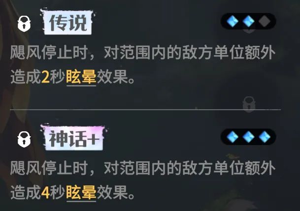 神话+进阶:眩晕时间提升为4秒,总计9秒的强力控制,进阶后收益很高。