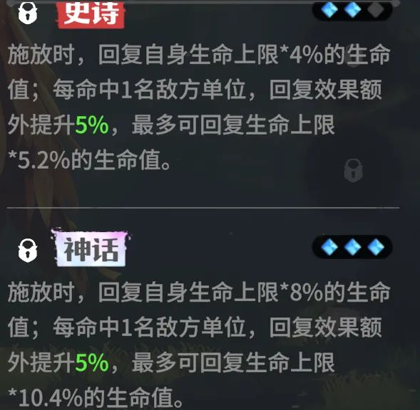 神话进阶:回复效果提升为生命上限*8%,最高回复10.4%,高生命值加成下收益可观。