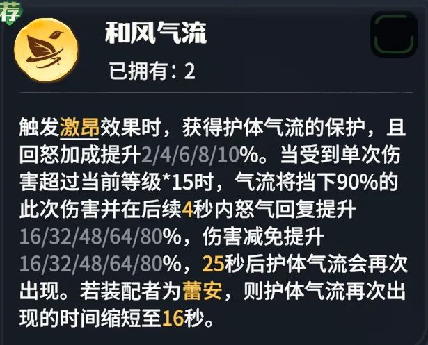 和风气流:蕾安专属,需要卡包抽取或者龙石碎块合成。进场时,获得受伤保护同时附加回怒效果,当受到爆发伤害时,会在4秒内获得巨量减伤和回怒加成,特效非常强力,蕾安携带还会减少保护循环的CD时间,收益很高,建议配置。