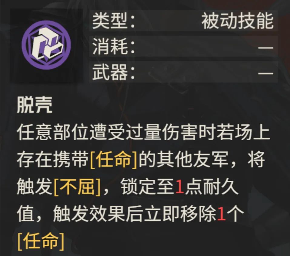 接着第三点是依靠【正奇有位】技能,科林可以自选给一位友方提供防御或输出的辅助功能,防辅方面是减伤护盾,攻击方面则类似于协力输出......但是大家需要注意的是,这个技能的AP消耗为4点,所以如果算攻击方面的协力输出的话,相当于科林就得牺牲自己回合内的一次输出,这个交换嘛到底划不划算呢?维一反正觉得经过实测,就科林辅助输出的伤害而言是绝对不划算的,所以此技能更多还是以辅助防御为主。