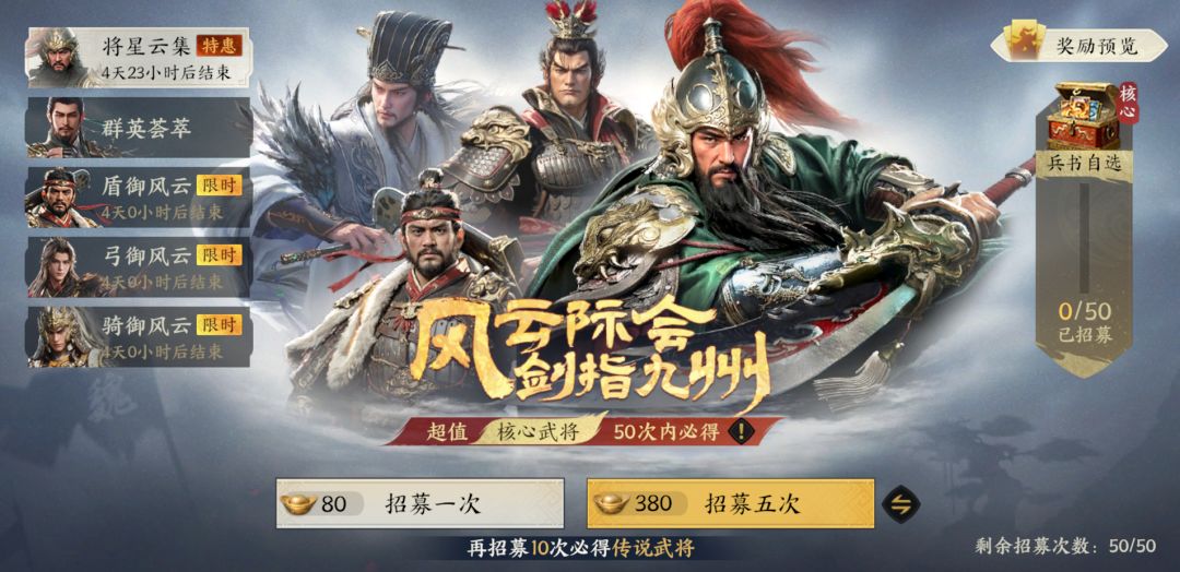 保底机制:10次招募必得1名橙色品质武将、50次招募必得1名核心橙色武将,并额外获得核心武将兵书自选宝箱 x 1。(基础概率: 橙色武将综合获取概率高达 17.5%,助力快速起航。)