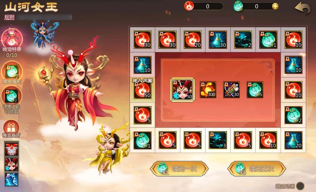 本期开启的奖池主题为【山河女王】,核心奖励山河女王碎片可用于进化成祥瑞山河兽和山河女王!