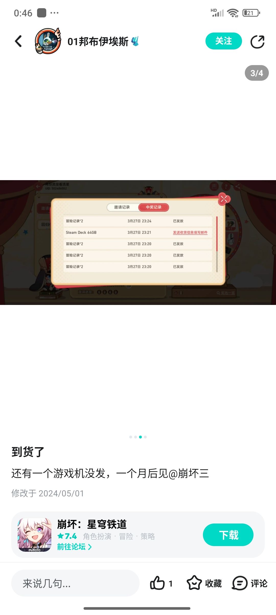 去年运气好好的,2.0的时候拉回归任务中了游戏机,价值几千块,大家说我托,现在看了这个游戏不适合我了数值高的要命,我开了两个服一个官服和哔哩哔哩服,中了游戏机是哔哩哔哩服,如果银河幸运星我又了50万星琼,当时这两个号都卖了