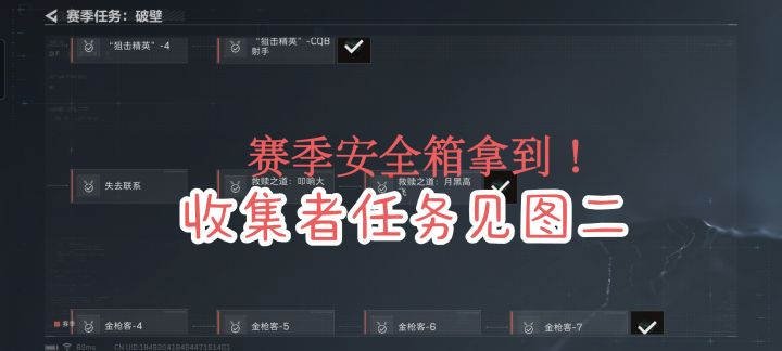 tips:放置道具的任务是最简单的,利用在选人界面大退的方法,最后七分钟进游戏,玩盾哥几乎没人会浪费子弹追你。前期唯一被卡住的任务是最高通缉,因为做的人多都在抢这个飞升任务。