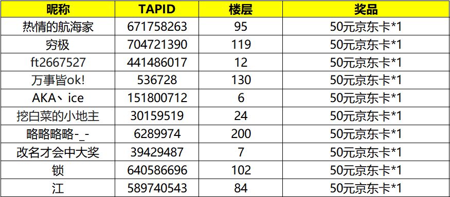 恭喜上述中奖玩家!其中原11楼获奖玩家“下雨啦”因缺乏狩猎截图,所以获奖资格顺延至12楼。请获奖玩家关注并私信联系小A,发送自己的楼层截图,小妖确认登记后,将在30个工作日内通过TapTap私信为您发放京东卡奖品,请您耐心等待~