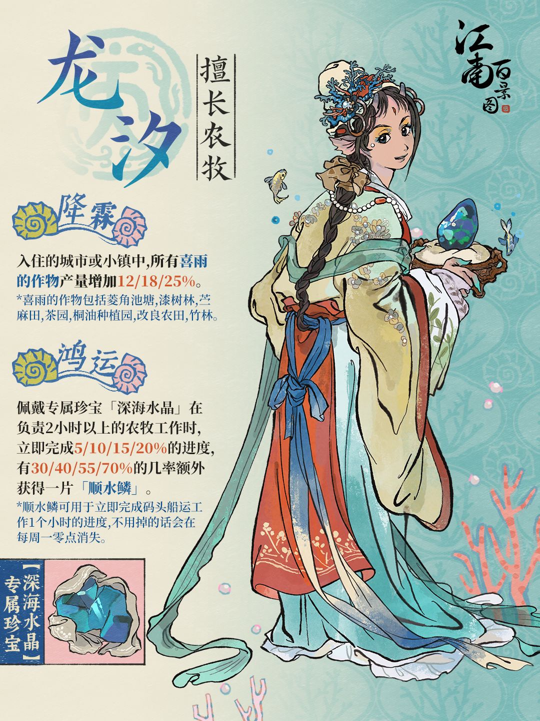 7月2日起前往「东海·金泥画池」执笔描画,将有机会邀请这位龙族公主入画江南。龙汐曾经掌管着潮汐的涨落,入江南之后,她很乐意为水上航行的船只提供帮助。龙宫的日子漫长且枯燥,她一直对人间的生活十分向往,期望日后可以永远留在江南。