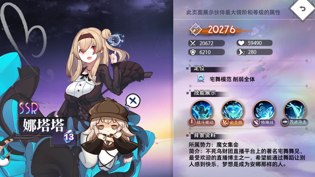 娜塔塔登场时,降低敌方所有伙伴20%的免伤率,持续2回合。