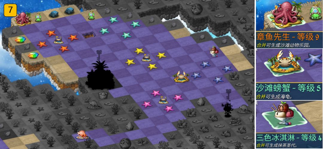 石化精灵蛋、珊瑚礁(限时关卡)、黄金沙滩蟹(看广告获得金叶子)、精灵蛋/蛋巢、文蛤(第二十七大奇迹:沙滩动物乐园初始合成建筑)、大海星(第二十七大奇迹:沙滩动物乐园初始合成建筑)等。