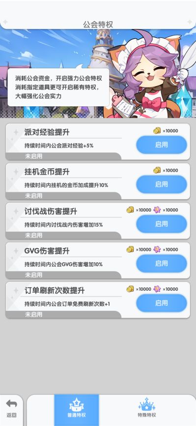 分为普通特权和特殊特权。普通特权可使用公会资金来开启获得相应的加成效果。特殊特权暂时还没有开放。
