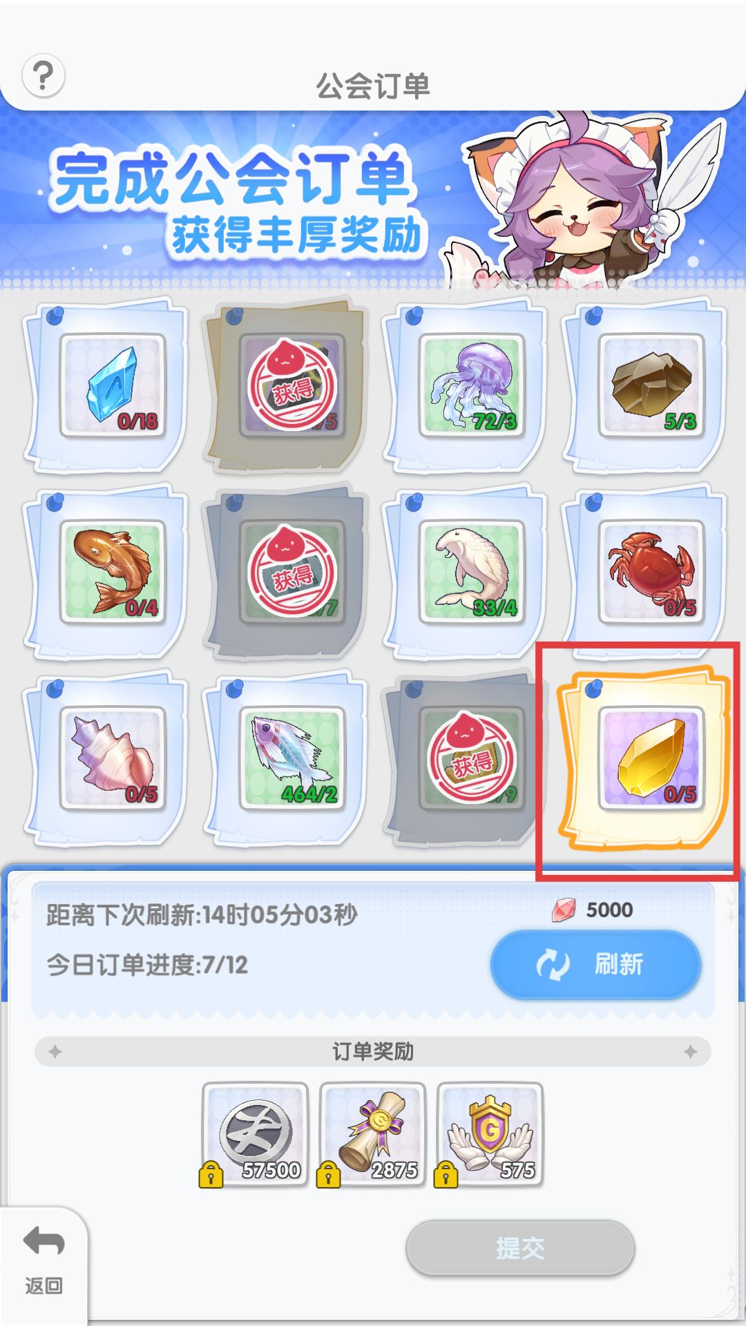 若对当前订单不满意,也可以尝试更换订单。公会成员可以使用5000水品更换公会订单。