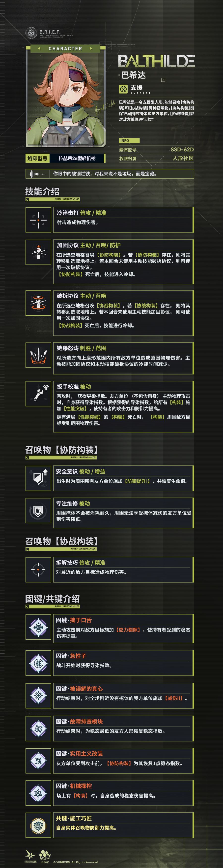 巴希达是一名支援型人形,能够召唤【协防构装】和【协战构装】两种召唤物。【协防构装】能保护周围的掩体和友方单位,【协战构装】能对敌方单位进行攻击。
