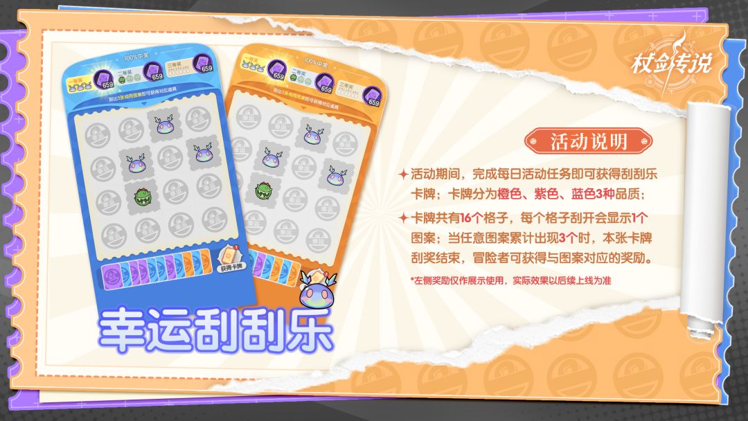 冒险者们大家好呀!这里是《杖剑传说》运营艾琳!星光史莱姆,无论出现在哪里似乎都是好运的征兆呢!如果同时出现三只,一定是头奖吧!今天给大家带来新一期活动情报——【幸 运 刮 刮 乐】【幸运...