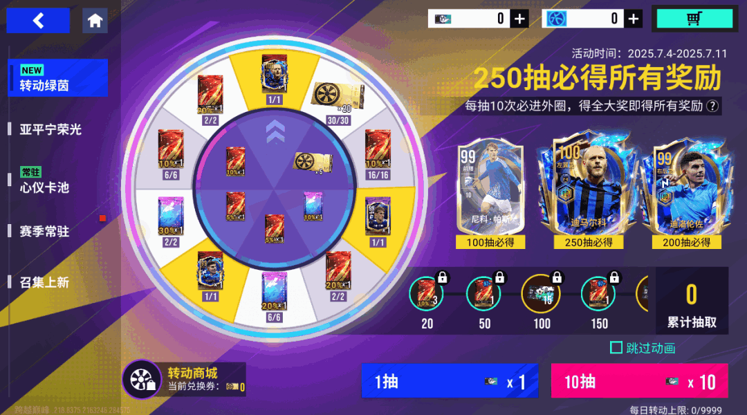【转动绿茵】新一期转动绿茵将于7月4日11:00-7月11日11:00开启,100联赛蓝巅峰迪马尔科隆重登场!本期大奖为: