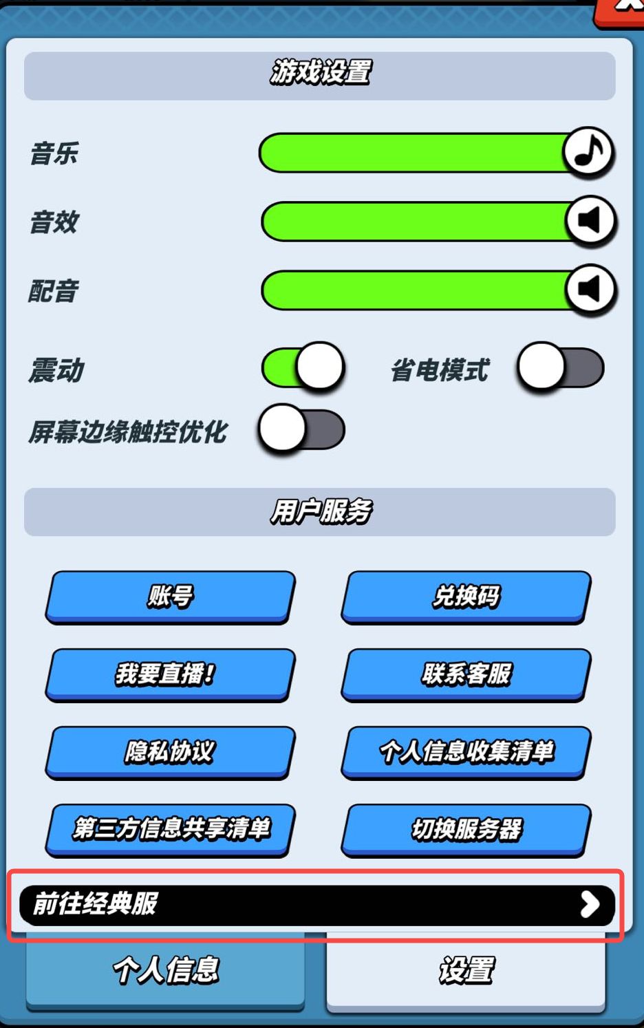 2.点击【设置】,点击【前往经典服】即可。如果您是iOS用户,则需要重启游戏,重启后的登录行为为默认登录经典服。