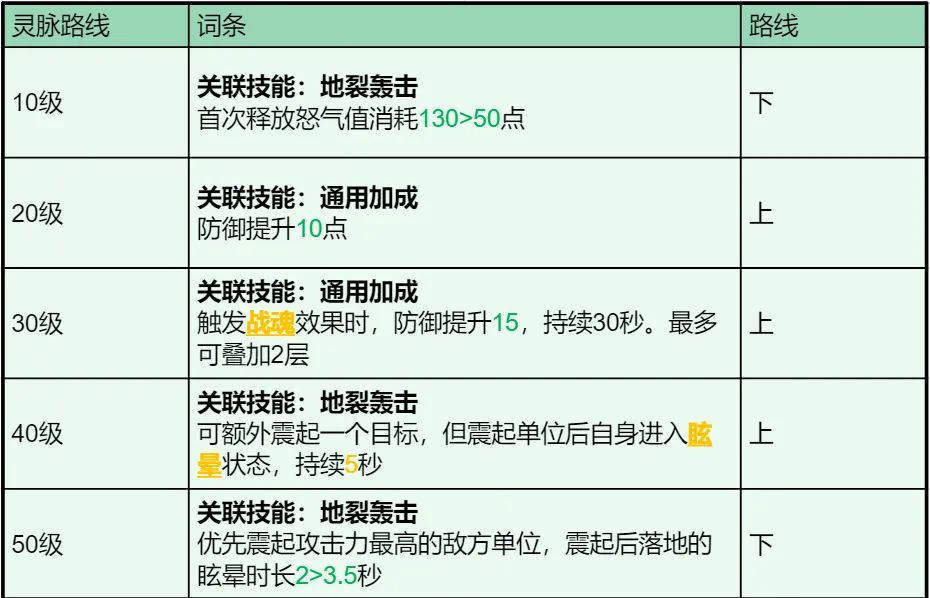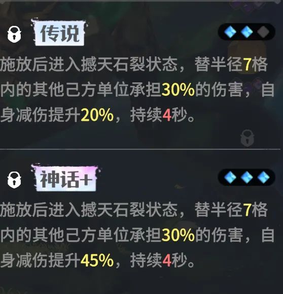 传说进阶:施放后进入撼天石裂状态,额外分担伤害并且提升减伤。增强军团生存能力。
