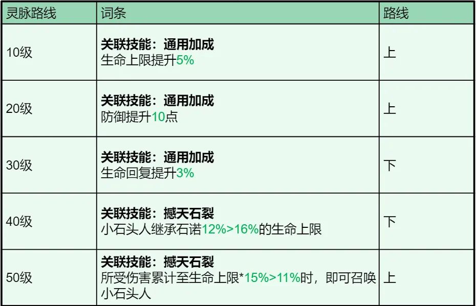 该套灵脉的思路能极限提升石诺的肉度,并增强召唤的小石头人的质量,吸收更多敌方的伤害。