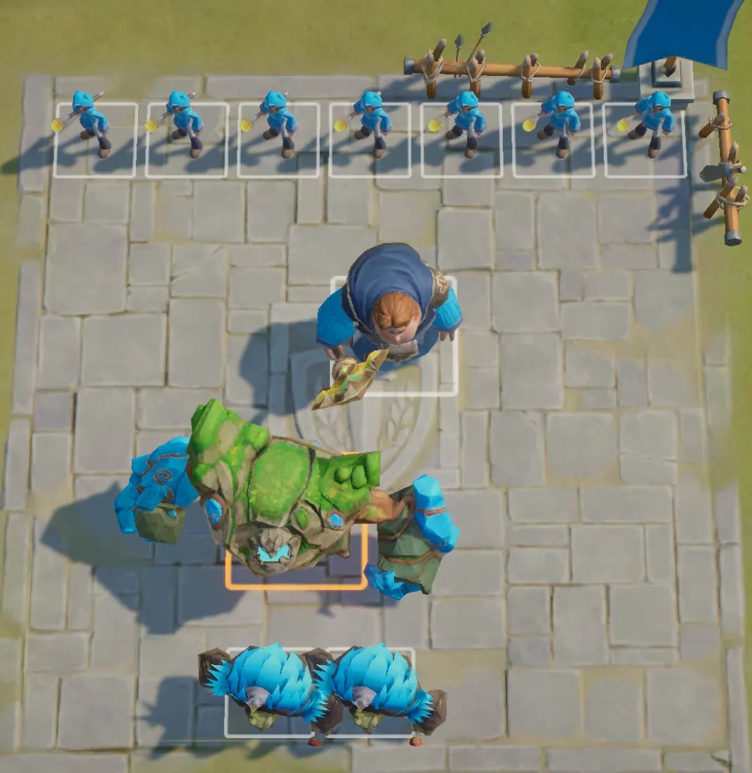 石诺站位靠前吸收伤害,丧气泥人护卫吸引刺客。茜莉丝+巨力橡果后排输出。