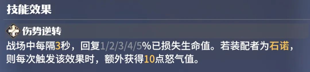 伤势逆转:石诺专属,可合成或者卡包抽取,石诺装备时有专属词条。不仅可以为石诺提供已损失生命值回复,每次触发回血效果,还会额外获得怒气值,缩短自身怒气技施放间隔。
